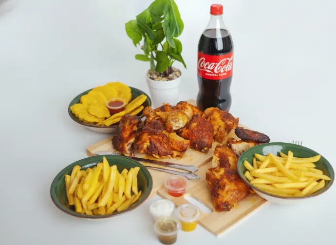 1 pollo entero + 8 deditos + 3 acompañamientos + soda 2.25 L + salsas.
